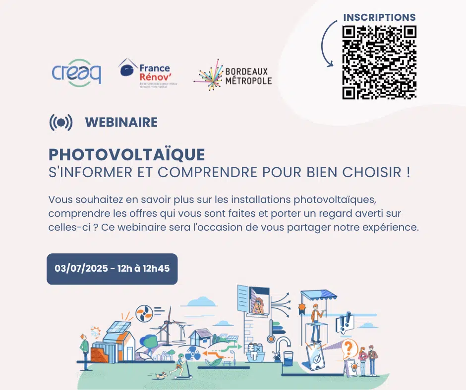 En partenariat avec MaRénov Bordeaux Métropole, le CREAQ vous propose un webinaire sur le photovoltaïque .